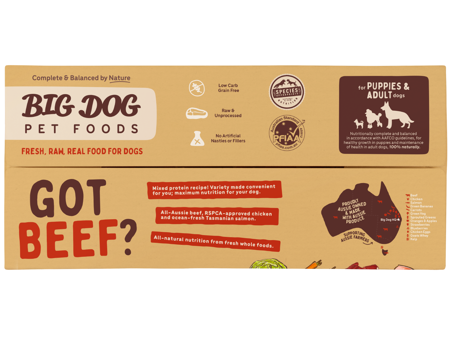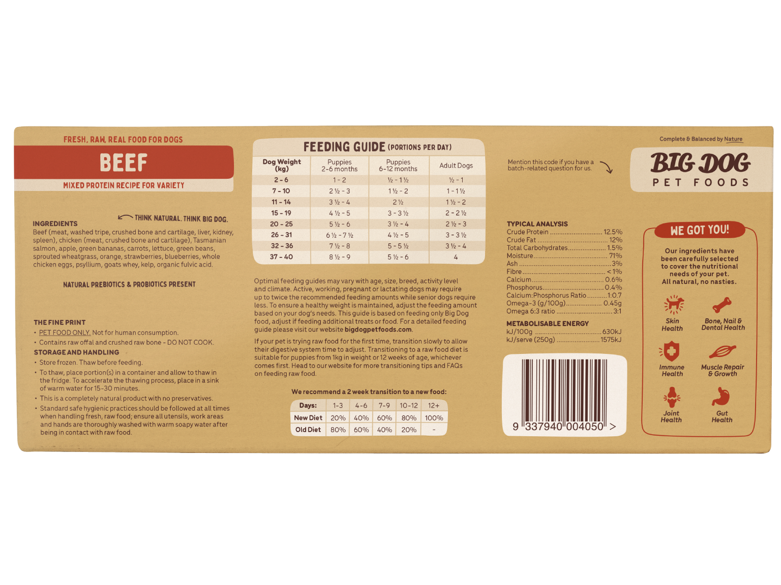 Perfect for active puppies and adult dogs, and those who thrive on a high-protein diet, Big Dog BARF Beef Raw delivers everything your dog needs for a healthy, happy life.