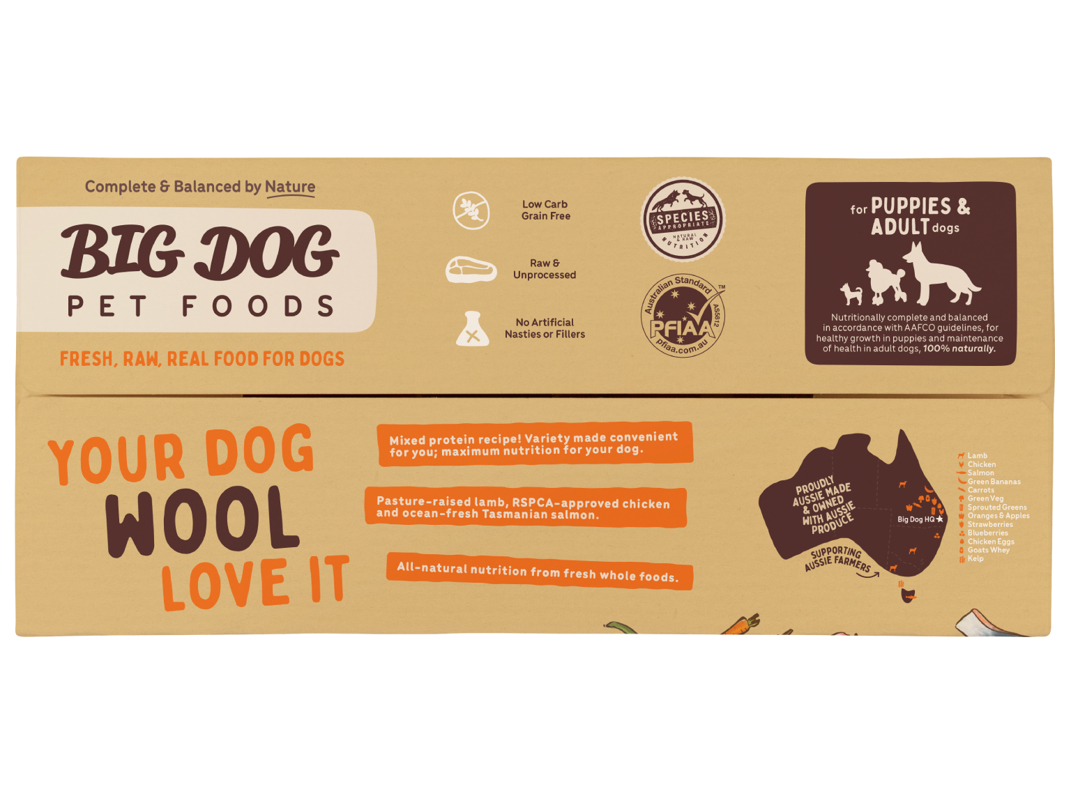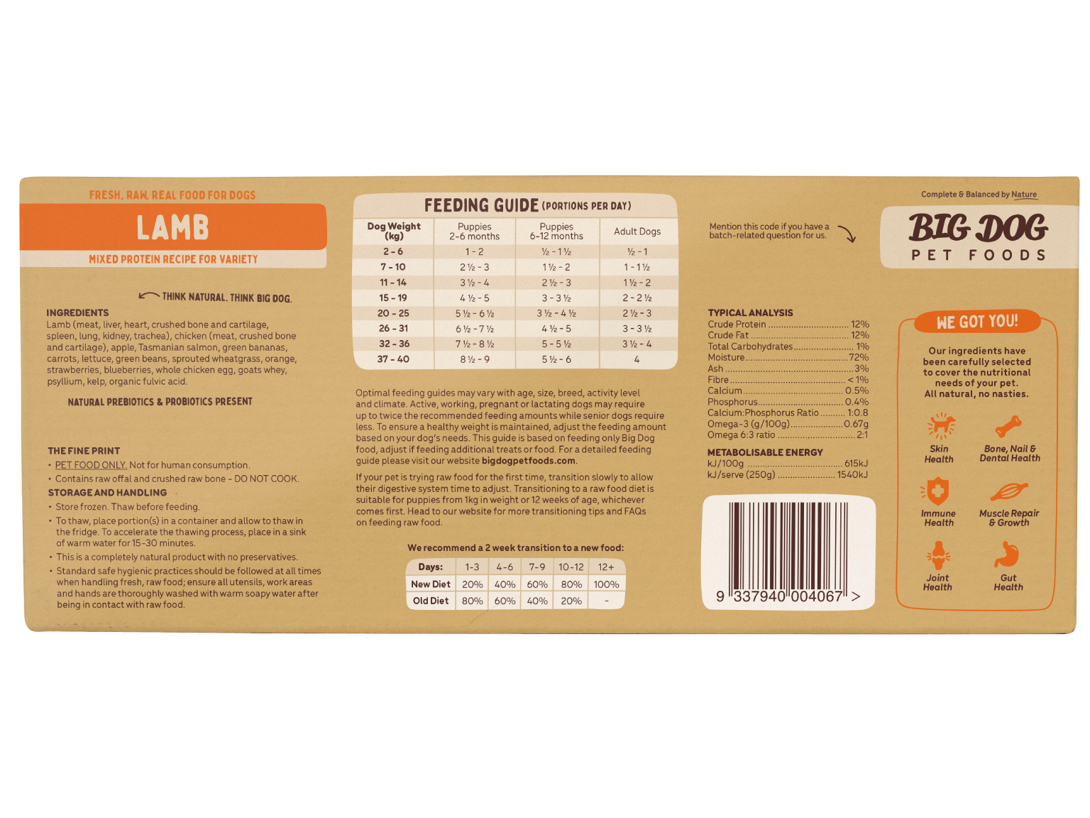 Perfect for pups who need a gentle but nutrient-packed diet, Big Dog BARF Lamb Raw helps keep your dog happy, healthy, and thriving.